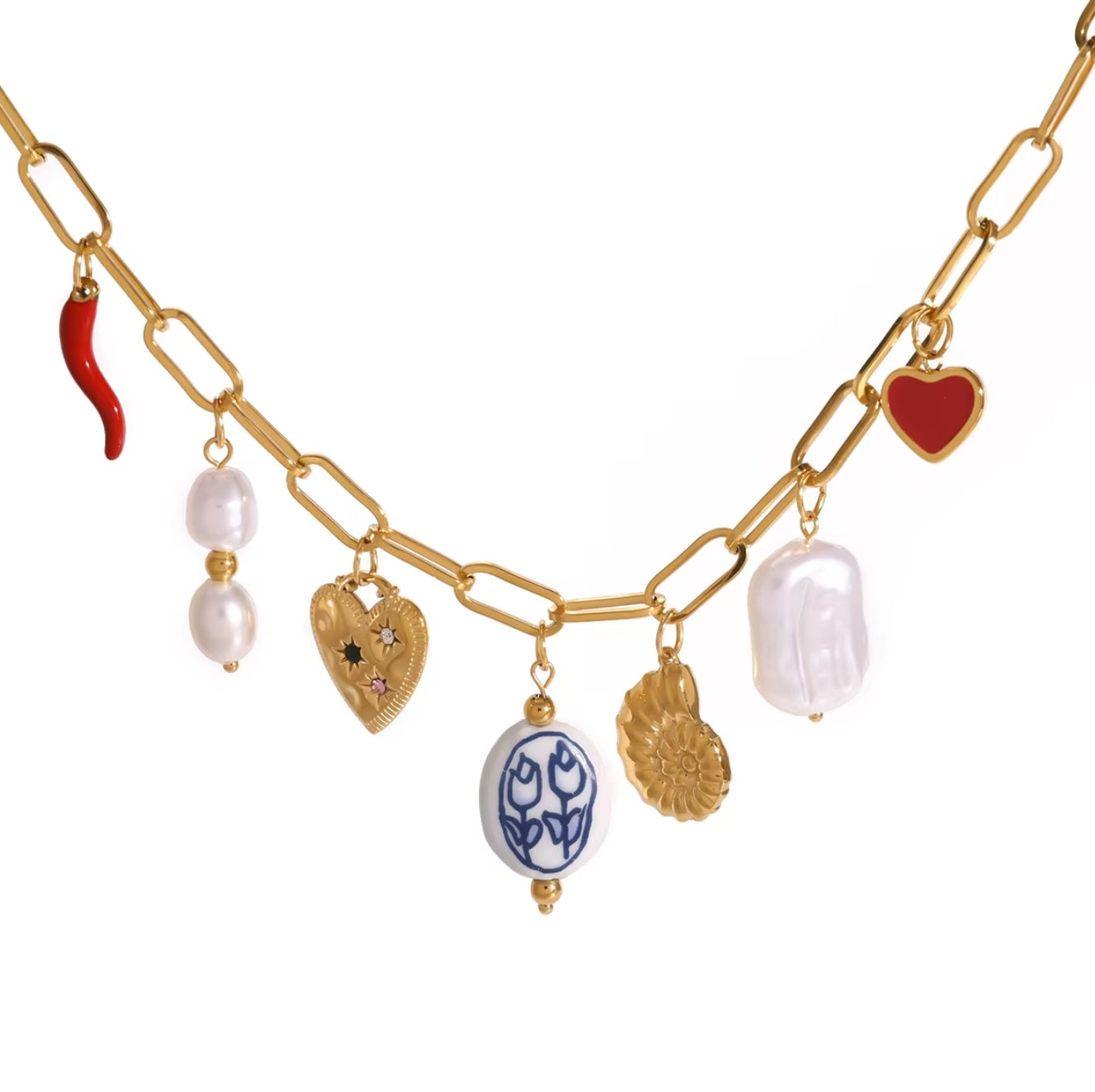 A bold paperclip chain decorated with six unique charms, mixing enamel, ceramic, and natural freshwater pearls.